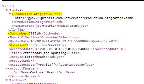The printIQ Job XML contains many elements, attributes and values to allow automated processing by supported production integration systems. As your third party system receives the Job XML from printIQ, use the below tags as guides to invoke file processing.