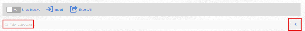When a value is entered into the search bar, only categories that have that text in the category name (and their parents) will be displayed. The Expand/Collapse All button becomes inactive when the search bar is in use.