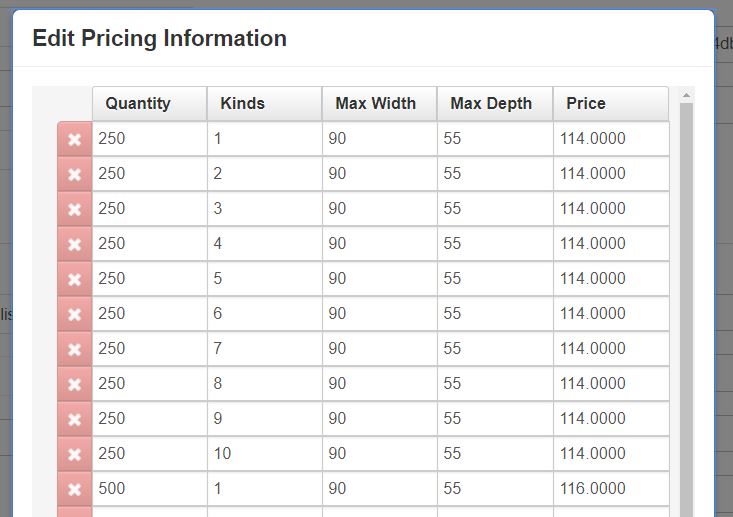 Lastly, you need to Edit Pricing Information. This is easier to do within an Excel spreadsheet, then copy & paste directly into the Edit Pricing Information modal.Essentially: you require a corresponding row for each quantity / kind combination you wish to offer. For example: a maximum 10 Kind business card with three available quantiy selections would comprise of 30 rows.