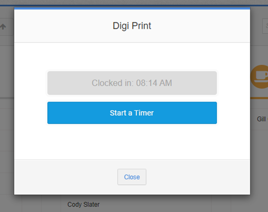 When clocked in the modal updates to show the Clocked In time, and the user will be prompted to click ‘Start Timer’: