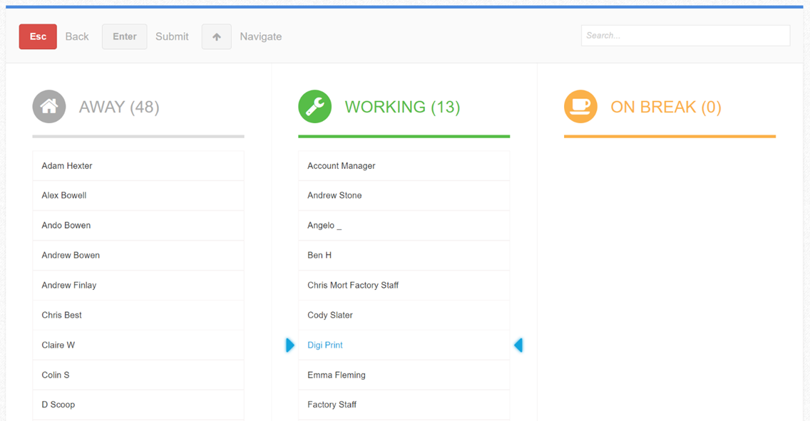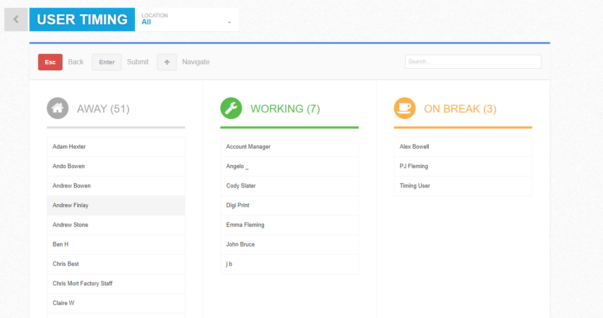 A user must select their name on the Timing Board. This screen can be navigated using the arrow keys.