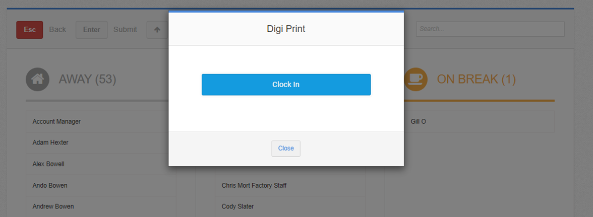 Once a username has been selected (clicked on or enter key pushed) a modal will appear. The user will need to Clock in, if clock-in is configured: