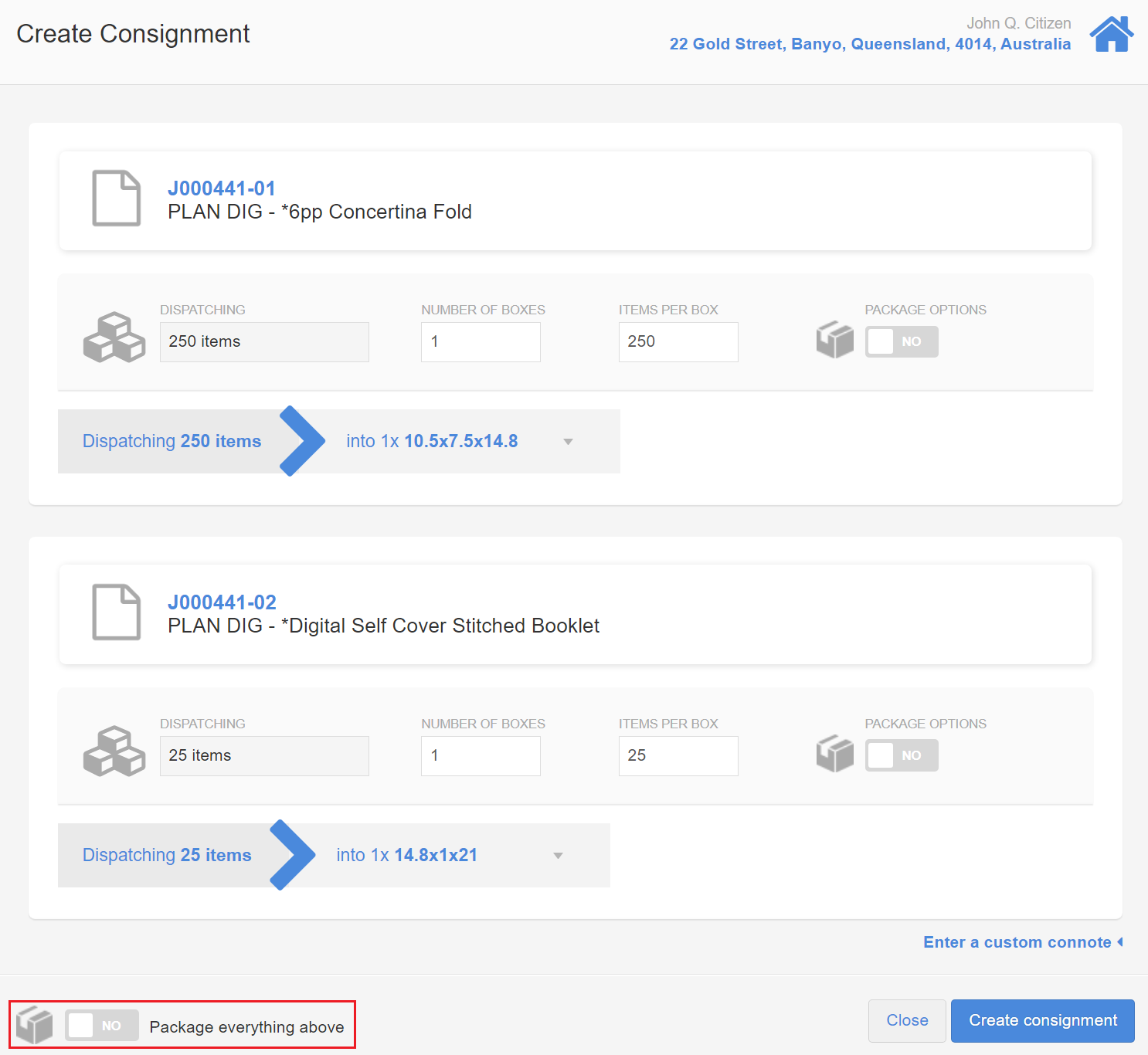 Clicking ‘Package everything above’ enables you to package the jobs into one or more outer boxes: