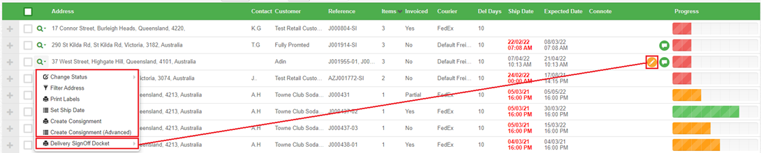 Delivery signoff is indicated by either an orange (Awaiting Signoff) or green (Signed Off) Pen icon: