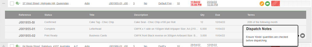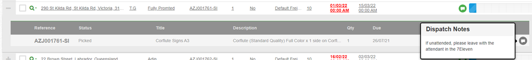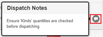 Hovering over the icon will display the Dispatch Notes on the delivery.