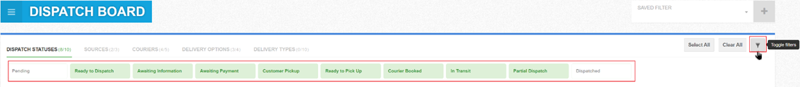 Filter options at the top of the board allow limiting the list to deliveries with specific Dispatch Statuses, Sources (Sales Order, Job and / or Campaign), Courier, Delivery Options (Standard, Samples, Proofs and Overs) and Delivery Types.