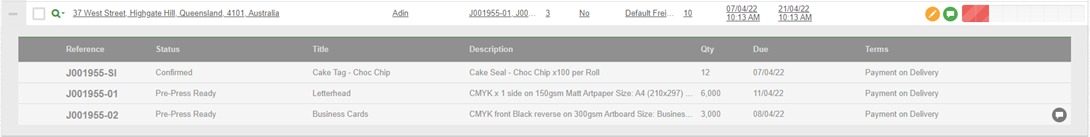 The ‘+’ expands the entry, showing the items (depicted by the number of items) within the delivery, the job or order number and the status of them: