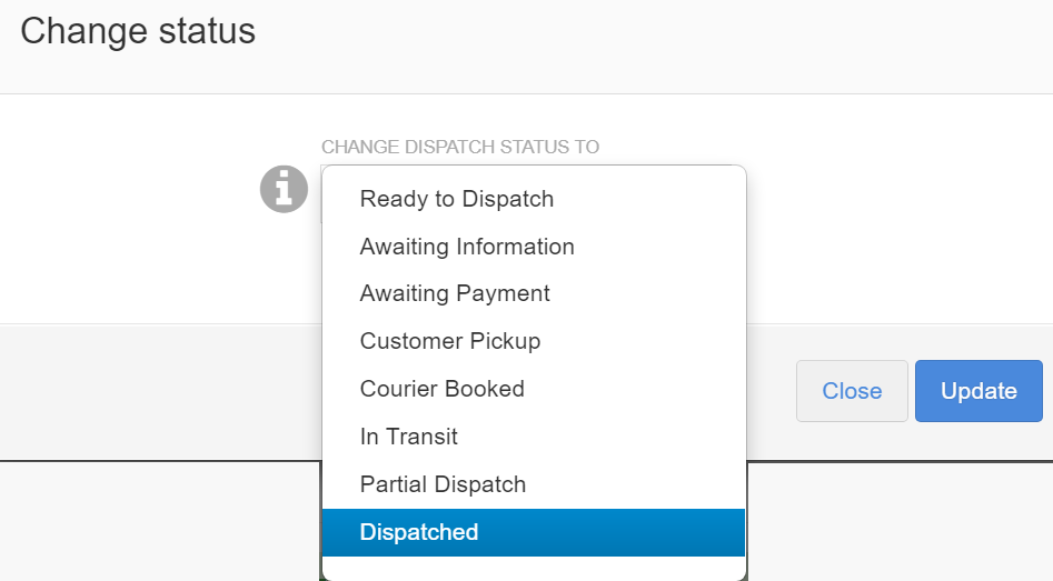 Clicking Change Status opens a Status Selector modal with ‘Dispatched’ selected.