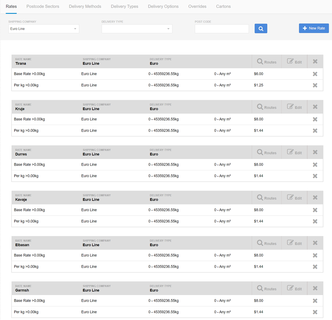 Searching for shipping company Euro Line returns the 6 new rule sets added for Albania: