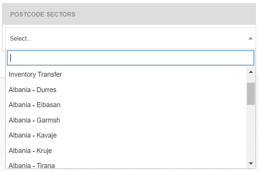 And under Postcode Sectors, any entries for Albania should appear above Australia (as they list alphabetically):