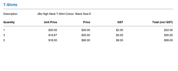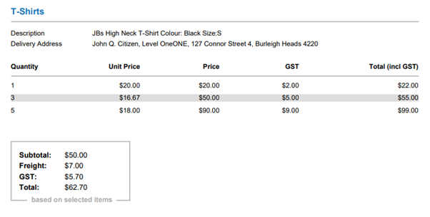 {{#ShowPricesForSelectedQuantities}}<div style="position:relative;"> <div class="total-prices-container"> <table class="total-prices"> <tr> <th>Subtotal:</th> <td>{{SubTotalPriceForSelectedQuantities_Formatted}}</td> </tr> <tr> <th>Freight:</th> <td>{{QuoteFreightPrice_Formatted}}</td> </tr> <tr> <th>GST:</th> <td>{{TotalGSTForSelectedQuantities_Formatted}}</td> </tr> <tr> <th>Total:</th> <td>{{TotalPriceForSelectedQuantities_Formatted}}</td> </tr> </table> </div> <div class="clear"></div> <div class="based-on-selected-text">based on selected items</div></div>{{/ShowPricesForSelectedQuantities}} |