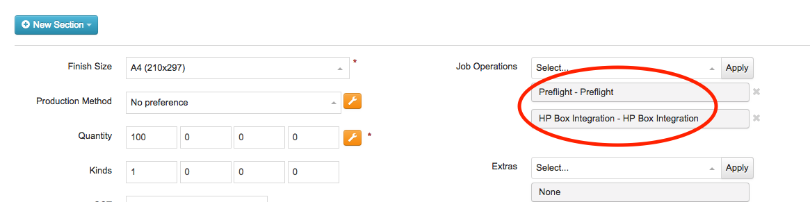 An example Custom Quote is as follows, with the "HP Box Integration" operation, and a Preflight operation:
