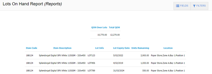 ‘Lots on Hand’ report lists all lots and their quantity and expiry for stock on hand:
