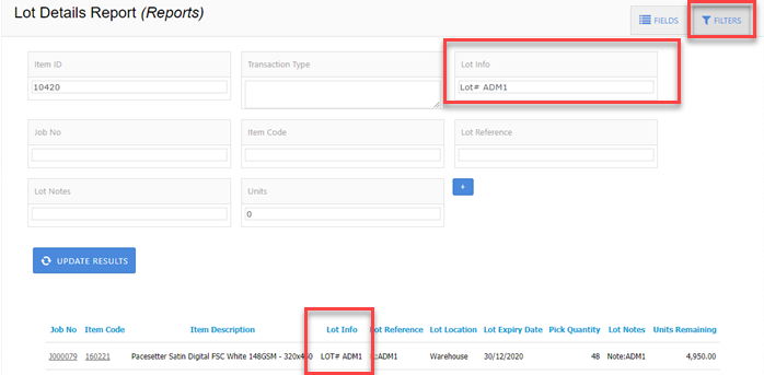 Here you can filter to a specific lot ID to see only jobs produced using the selected lot: