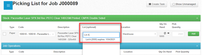 From the stock pick screen, you will see a field called ‘Lot (optional)’: