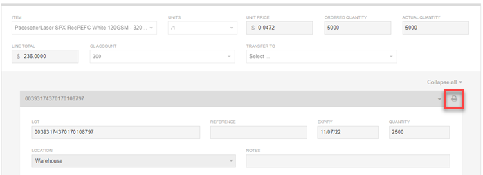 ‘Lot Labels’ can be printed from the purchase order from the lots ‘Print’ icon: