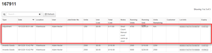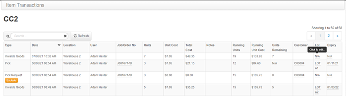 Against an ‘Inwards Goods’ transaction, click on the ‘Lot’ or ‘Expiry’ filed:
