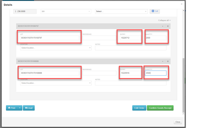 In this example we receipt in 2 lots. Click the ‘Lot’ button twice: