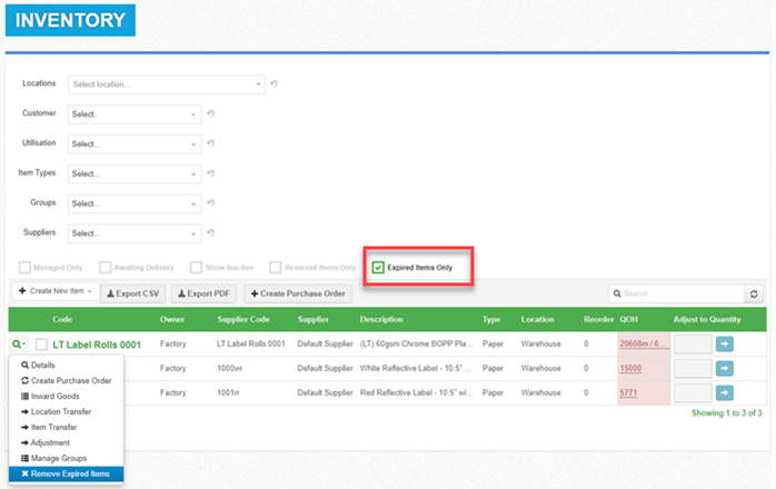 Back on the Inventory board, using the filter to show ‘Expired Items Only’, against the item select to ‘Remove Expired Items’: