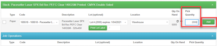We first pick 2000 qty from ‘Lot A’. Select the lot, enter the pick qty and click ‘Add’: