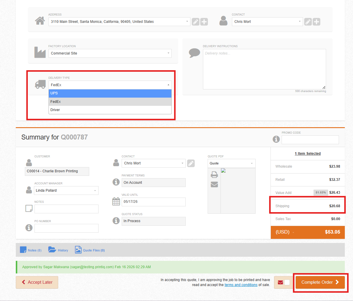 After 'Price Shipping' has been clicked, available shipping options will display on-screen. The price from the selected option will replace N/A in the pricing summary and it will be added to quote totals. The Complete Order button will become active: