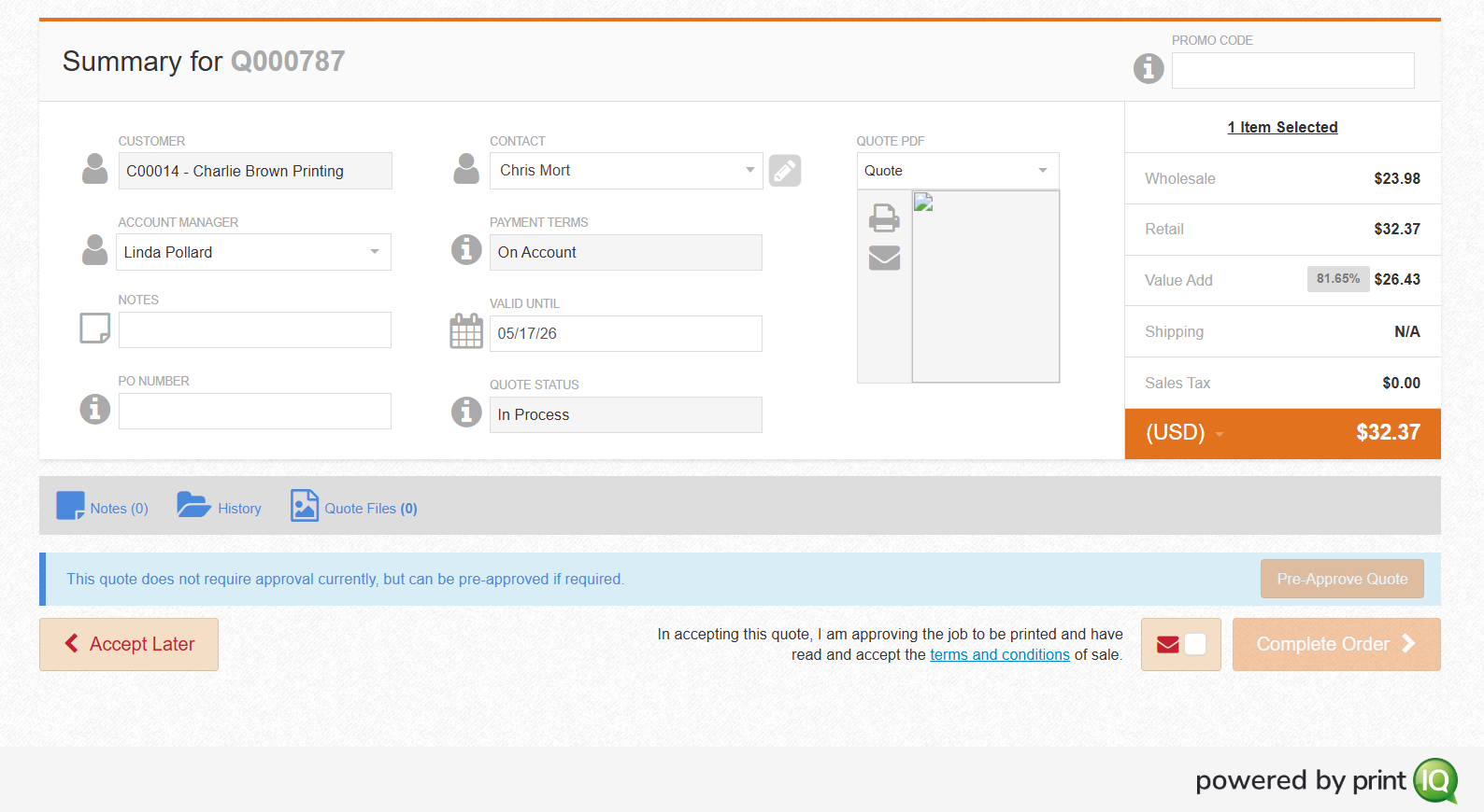 Instead of the system automatically calculating shipping prices, users can decide when printIQ does this calculation. However, a shipping price must be calculated before a quote can be accepted.