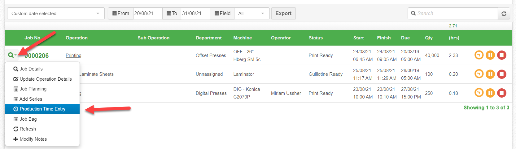 Here you ‘plan’ the job by selecting the machine, operator, start and finish times: