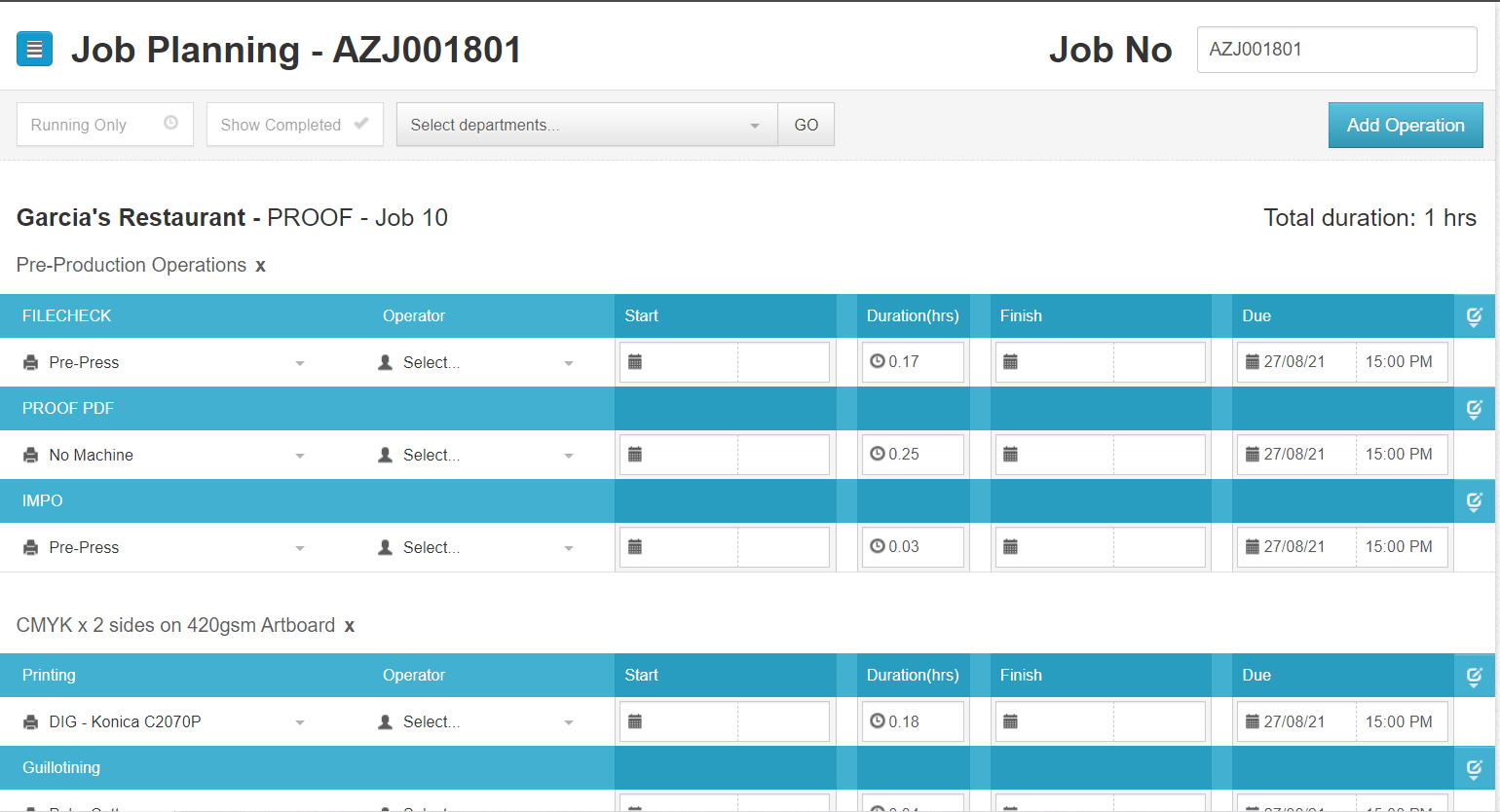 The ‘Job Planning’ screen will open. This screen shows you in a list view all of the ‘job operations’ that makeup the complete job: