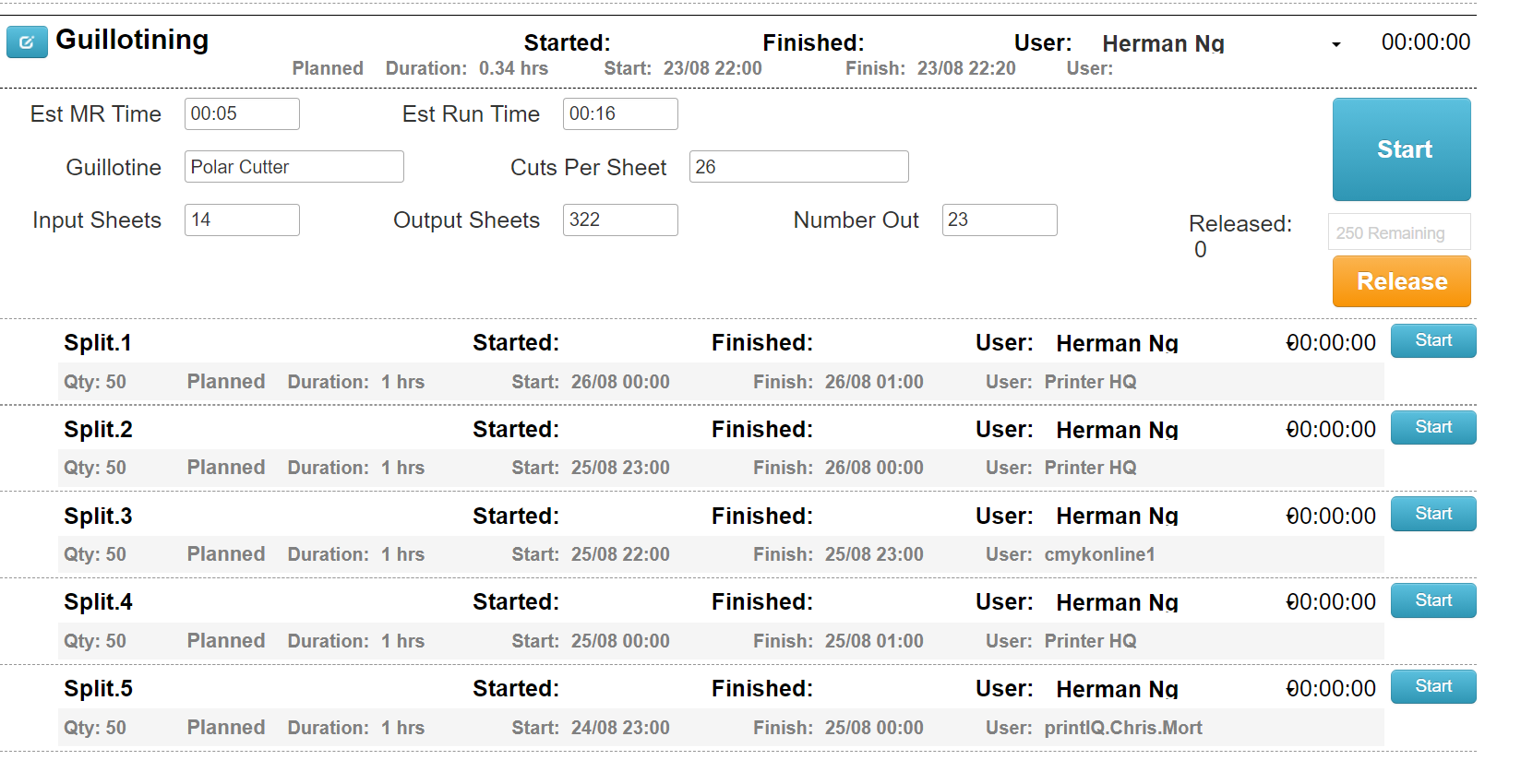 The job bag will show all production splits and sub operations individually for operators to log onto: