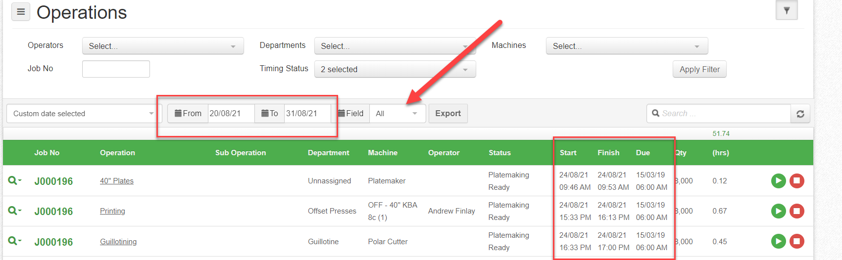 You can select ‘date ranges’ to search by and filter the date to search on start, finish or due date or a combination of all: