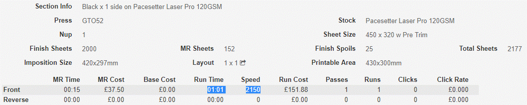 The press ‘speed’ is a calculation of the calculated elapsed time of the operation to run the Total Sheets (2177 above) thru the press.