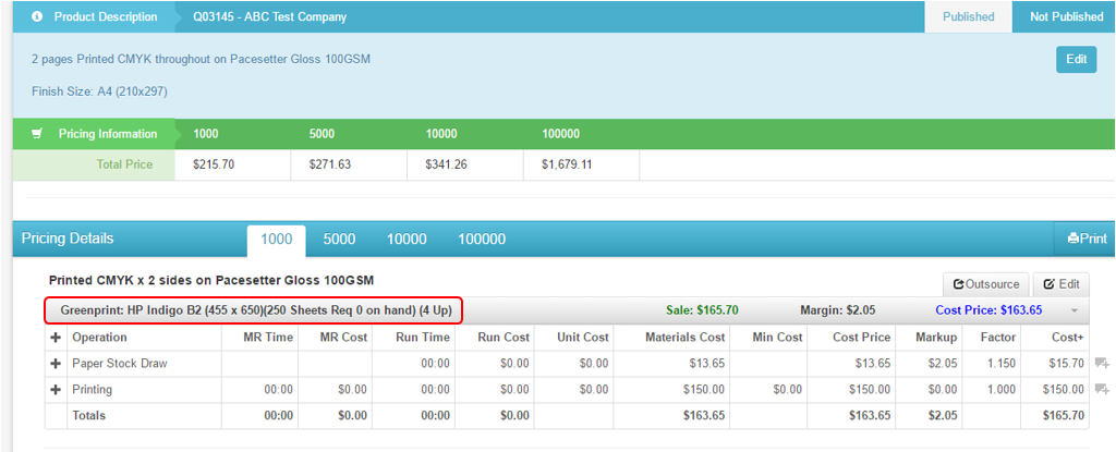 Because of the priority 1 for the HP Indigo B2 Digital Press and is the cheapest option for the quantity of 1000 on this quote this option gets chosen. With the KL540 Sheetwork Offset press the second option because of its priority 1.