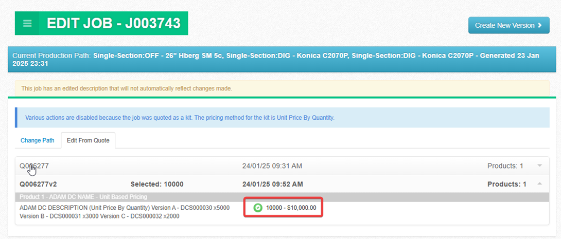 Job’ screen. You will see the new versioned quote available: