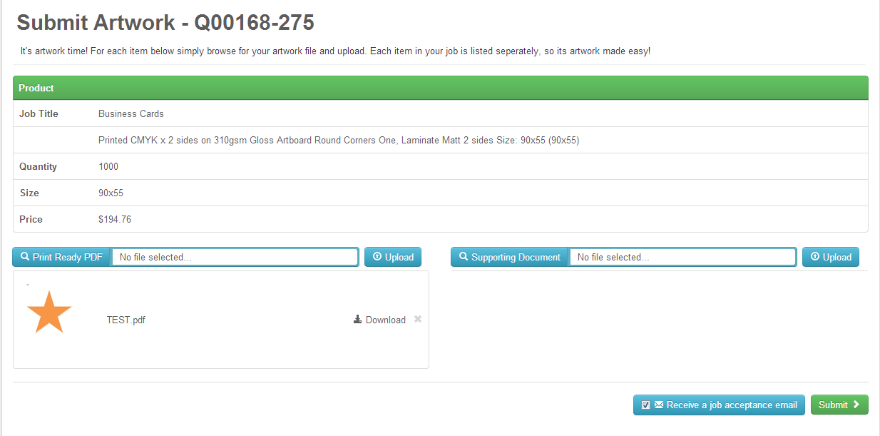 Click ‘Submit’ to continue (if you do not have artwork, when you click ‘Submit’ a box will show asking you to enter a reason that there is no file. You can then continue from there).