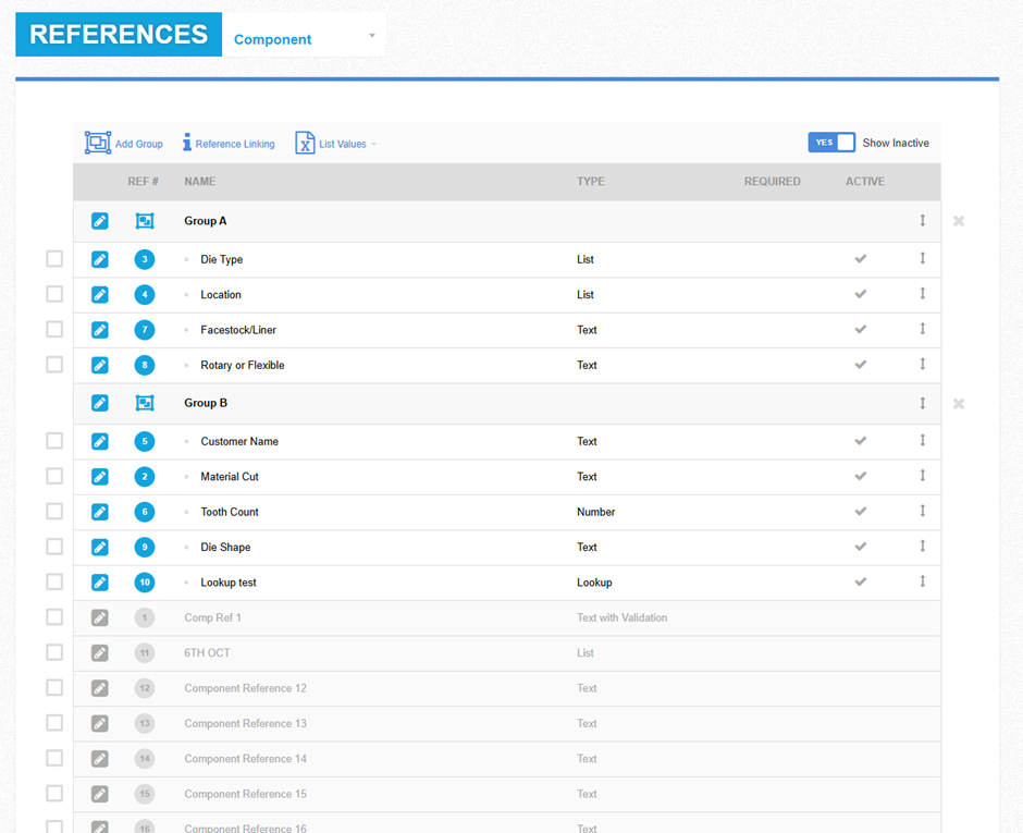 A reference must be set to 'Active' to become usable. Once it has been made active it will move from the greyed out references list at the bottom of the screen, to the bottom of the ungrouped reference list. When a reference is active it can be dragged and dropped into position or into a group on the screen. It can also be given a name, a reference type as well as a default value.
