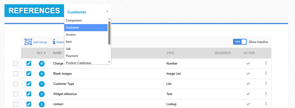 Component, Customer, Product Catalogue and Task all have 20 references available. Invoice, Item, Job, Payment, Product Catalogue, Quote, Quote Product and Rework all have 30.