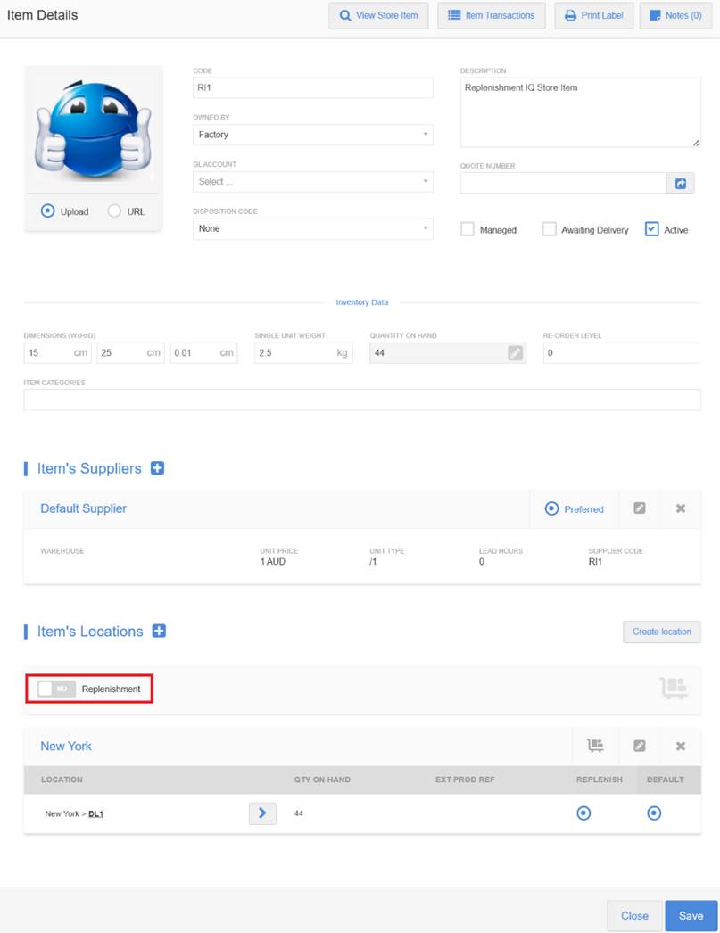 inventory items’ details to enable and configure replenishment behaviour for each