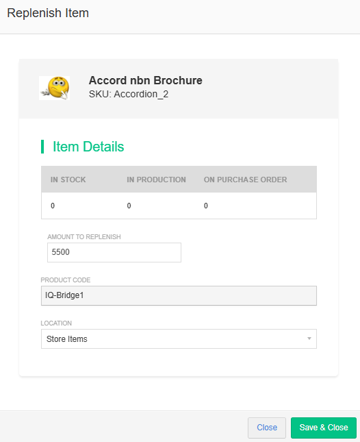 Each item in printIQ has an inventory record, managed from the Inventory board. The replenishment workflow can be configured on either the items inventory record or via CSV upload.