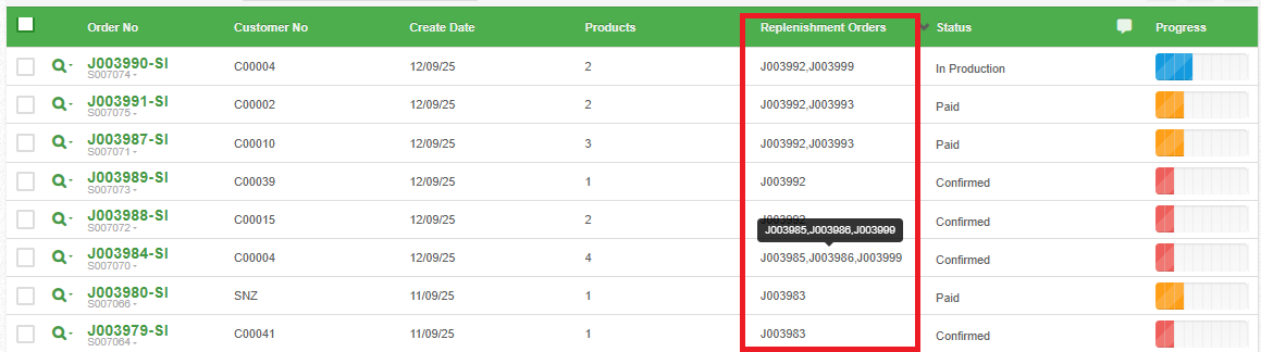 a list of orders linked to the replenishment job…