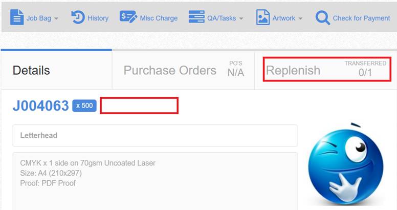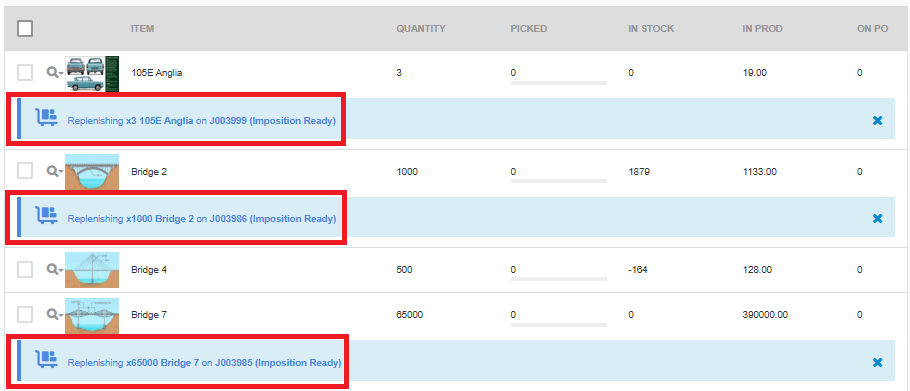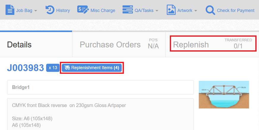 ‘Replenishment Items’ link shown next to the job number as the production job