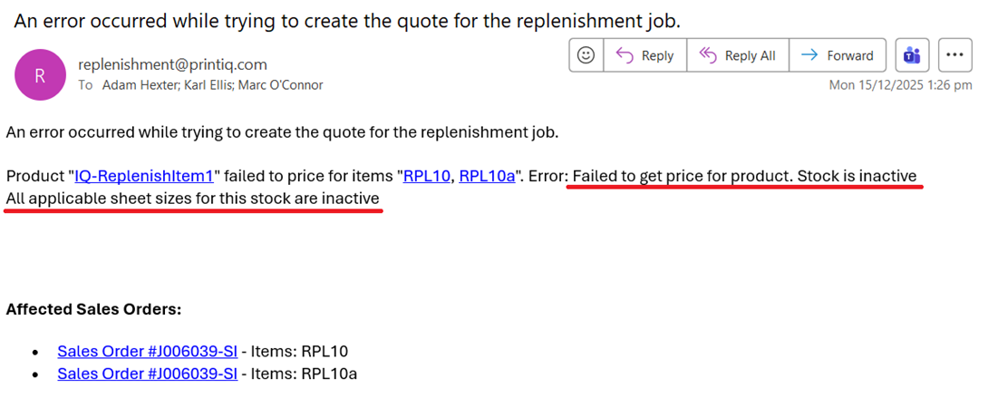 When printIQ is unable to create a replenishment job,