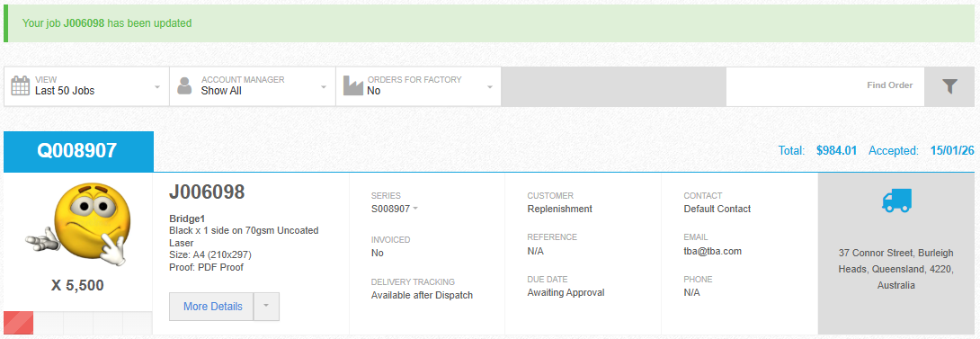 The quote is accepted and a job is created...