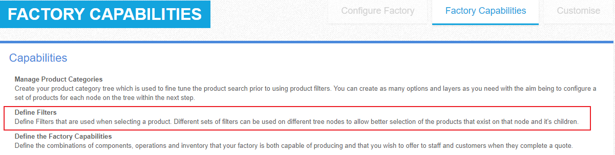 Go to Admin > Factory capabilities. Select “Define Filters”