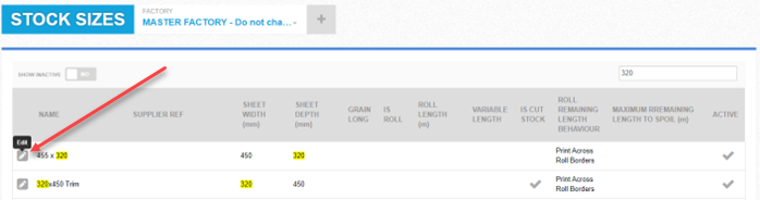 This will open an admin screen listing all existing stock sizes: