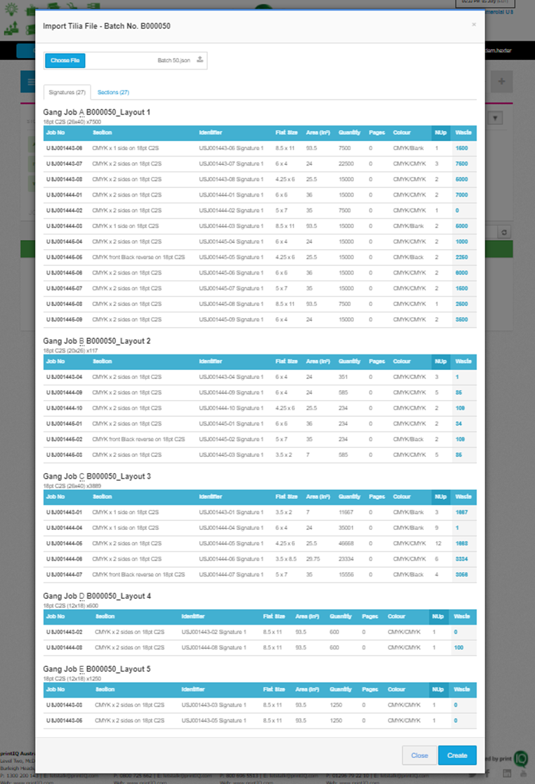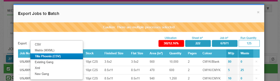 The filtered jobs can be exported as a batch to import into Tilia Phoenix imposition software.