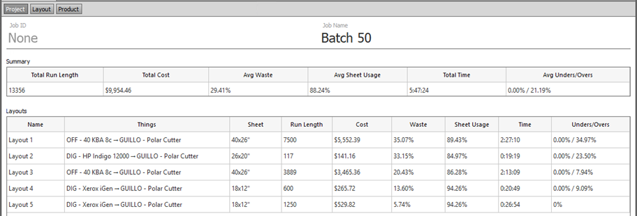 The results below show Phoenix has compiled the 27 jobs into 5 layouts over a mix of digital and offset presses: