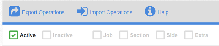 On the Operations screen, there are three buttons located on the toolbar at the top. These buttons either export or import a CSV file containing the displayed operations’ details as well as a Help modal that describes each field in the CSV: