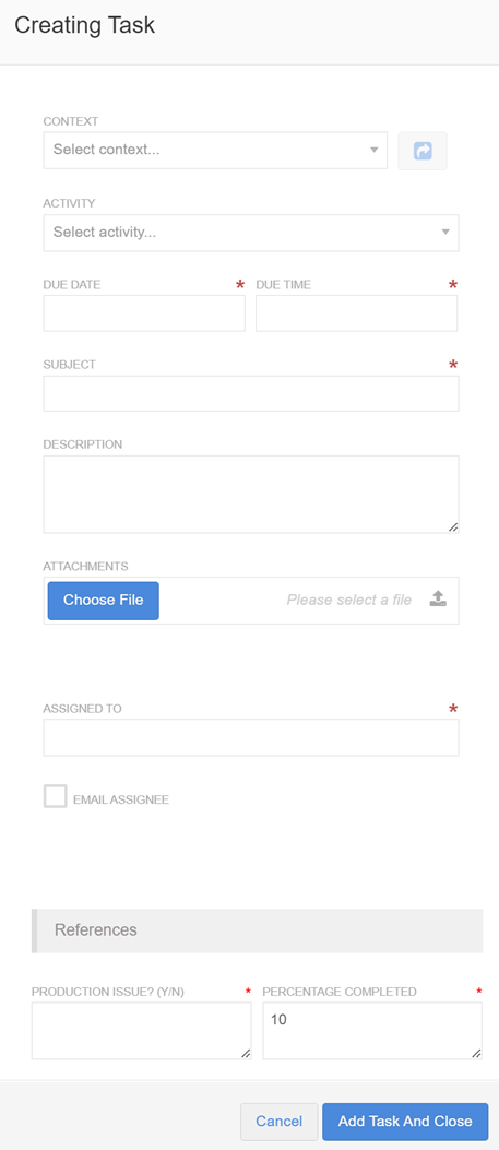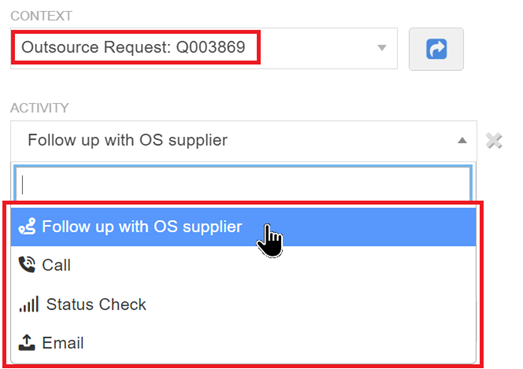 Once a context is selected, the activities pertaining to that context type are listed in the Activity selector. Setting an activity is optional. Select an activity relating to the task or leave it blank: