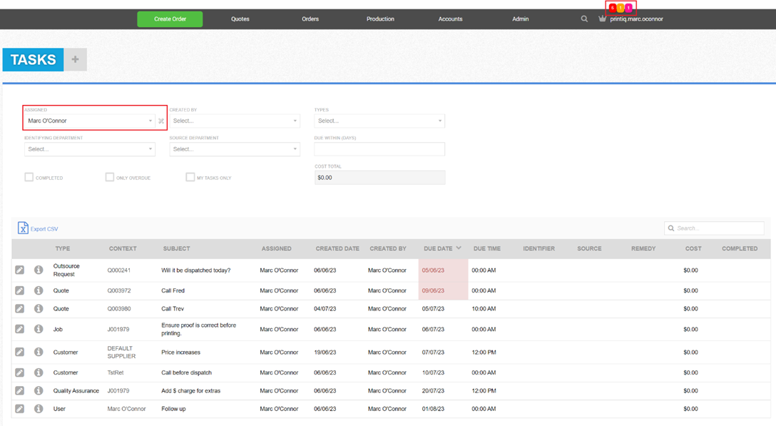 Tasks can be added from various points in the application. Account Status Check, CXML Order and XMPie Order tasks are automatically generated when there are issues with these integrations.