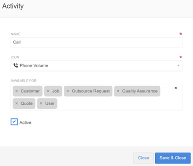 The 'Name' is the activity itself while the icon can be selected from a pre-defined drop-down selector when creating/editing the activity.
